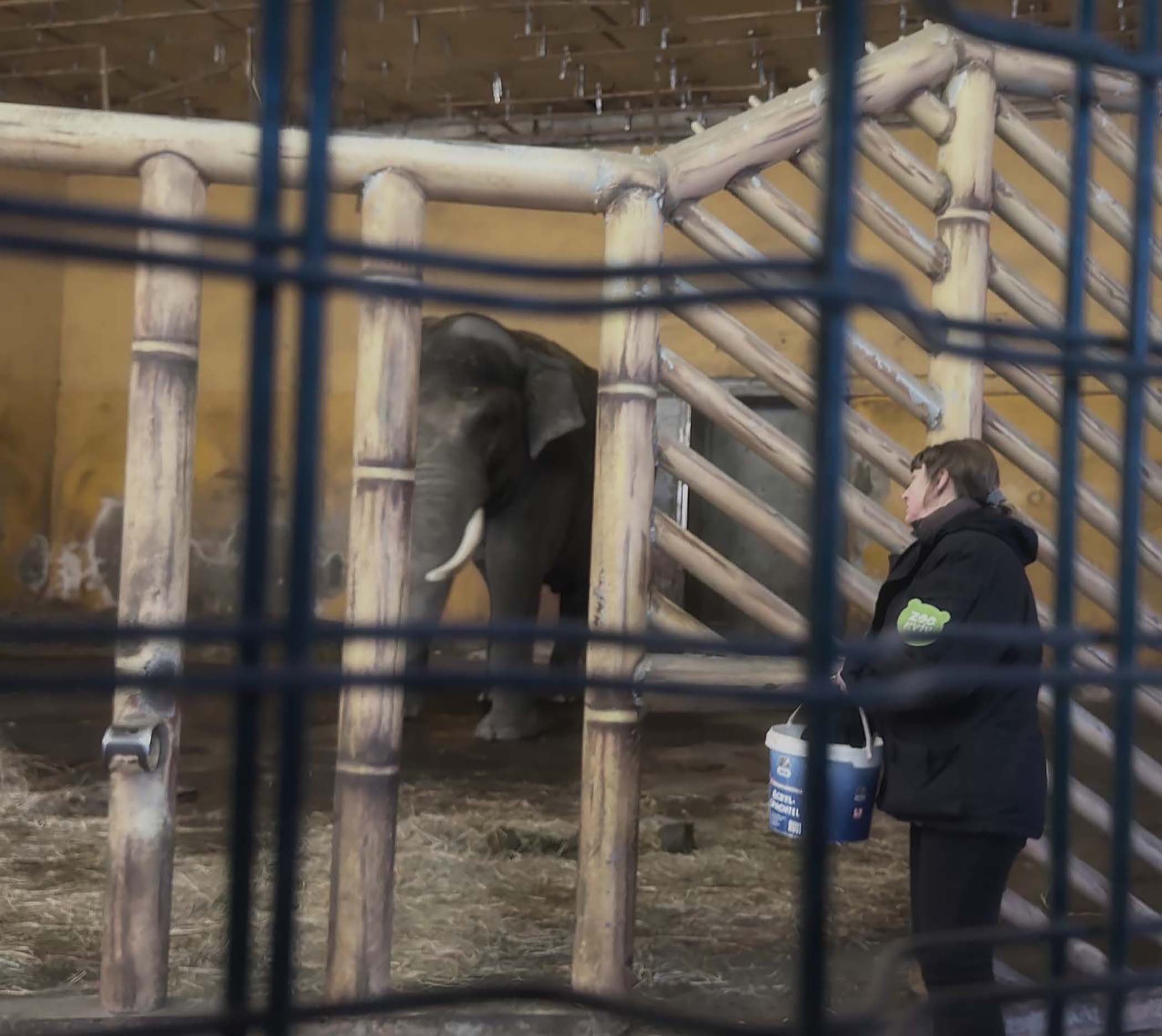 As she spoke about Horace, Sluzhenk walked me into the building where he spends much of the winter. The entrance room is where Sluzhenk sleeps as she cares for him. In the second, much larger room, the elephant stood in a gated enclosure. Upon seeing Sluzhenk enter, Horace walked to where she stood to greet her, reaching his long trunk through the fence to take a green apple sitting in the palm of his caretaker’s hand. After eating the apple, he offered to rub his side against Sluzhenk before walking off to the farthest corner of his space. Ukraine’s winters are harsh, and snow is common well into the spring. Horace spends the coldest days in his heated enclosure.
