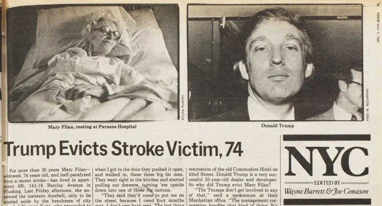 For more than 30 years Mary Filan — widowed, 74 years old, and half-paralyzed from a recent stroke — has lived in apartment 6B, 143-15 Barclay Avenue in Flushing. Last Friday afternoon, she answered the insistent doorbell, only to be pushed aside by the henchmen of city marshal Norman Katz, who proceeded to cart her belongings out to an idling truck. Taped to her door was an eviction notice from her landlords, the Trump Organization.