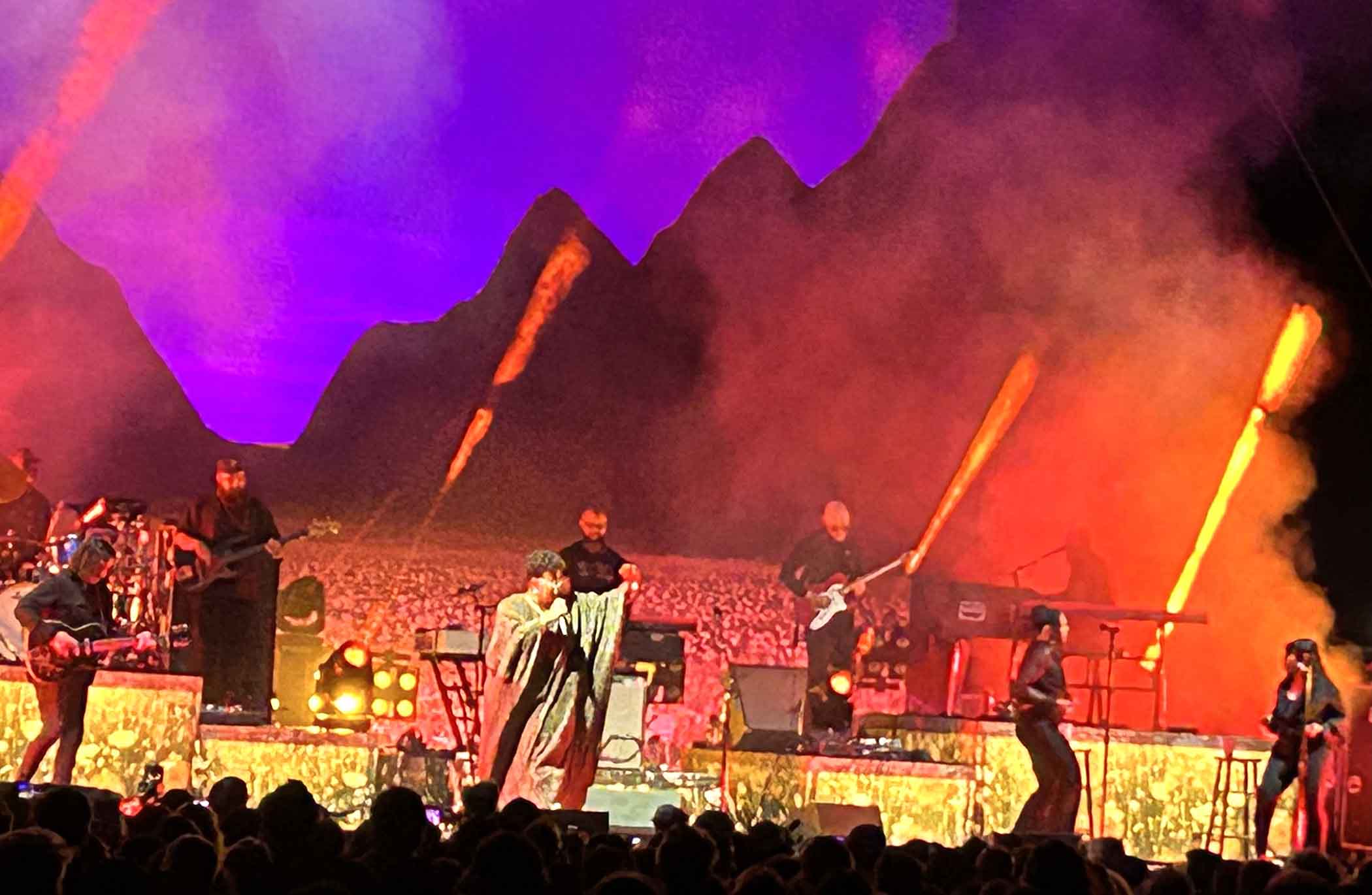 And so as the evening darkened, the peoplescape, from my bleachers’ vantage point, changed from reclining figures on blankets to a sea of heads all the way to the stage. To cheers and applause, Kiwanuka walked out from the wings in a loose whitish suit, immediately getting down to business with “Lowdown (part i)” in that soulful, sometimes raspy voice: “Make my way through the night / To the so-called jubilee.” The audience was now in a jubilee of feeling — the sea of heads swayed as though creating waves — his music not just giving us something but pulling something from us as well, as the best songs do. With an eight-piece band behind him and his piercing guitar, Kiwanuka went on to perform such songs as “Hero,” with an almost scary shuddering percussive break midway, befitting its subject of racist murders; the naked plea for help “Rule the World,” with an electrifying turn from backup singer Emily Holligan; and, of course, “Cold Little Heart,” its intro background “oooh”s taking us into swooning territory. Throughout the set intriguing images appeared on a large screen behind the group, beginning with a baby’s face, perhaps messaging the title of Kiwanuka’s forthcoming album, Small Changes. He closed with the tormented yet defiant “Love & Hate,” which echoed “Cold Little Heart” in subtle piano riffs but featured a screaming electric guitar. It felt like a cathartic ending: “Calling all the people here to see the show / Calling for my demons now to let me go,” Kiwanuka sang.