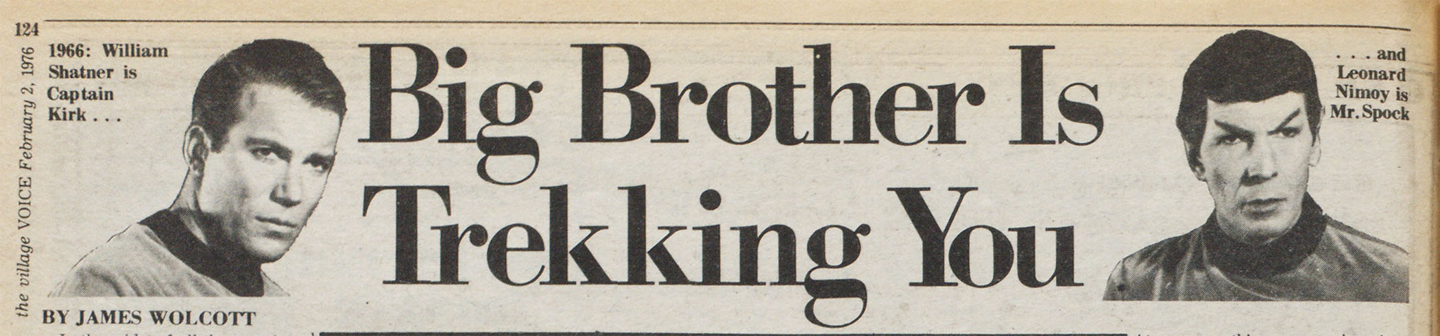 Editor’s note, January 30, 2026: Star Trek first hit the airwaves in 1966. Fast forward a decade, and the front page of the Village Voice features a kid sporting Spock ears, setting a headline editor to muse on whether the show, with its swashbuckling stud captain and disciplined, martial crew, represented a will to power rather than Sixties flower power. A wide-ranging culture critic, he references the civil war that had recently begun in Angola (which would drag on for decades), Lou Reed’s splendiferously abrasive double album Metal Machine Music, dance choreographer Twyla Tharp, literature critic Leslie Fiedler, and numerous other cultural and political touchstones of the day. He concludes, “What one comes to understand is that aside from the show’s superb production values, respectable acting, and intelligent writing, the real basis of ‘Star Trek”s popularity is sex, cool, and technology.” He also zeroes in on its fanatical, not to say cultish, fan base, his pungent observations presaging William Shatner’s iconic “Get a life” sketch on Saturday Night Live, exactly a decade later. — R.C. Baker