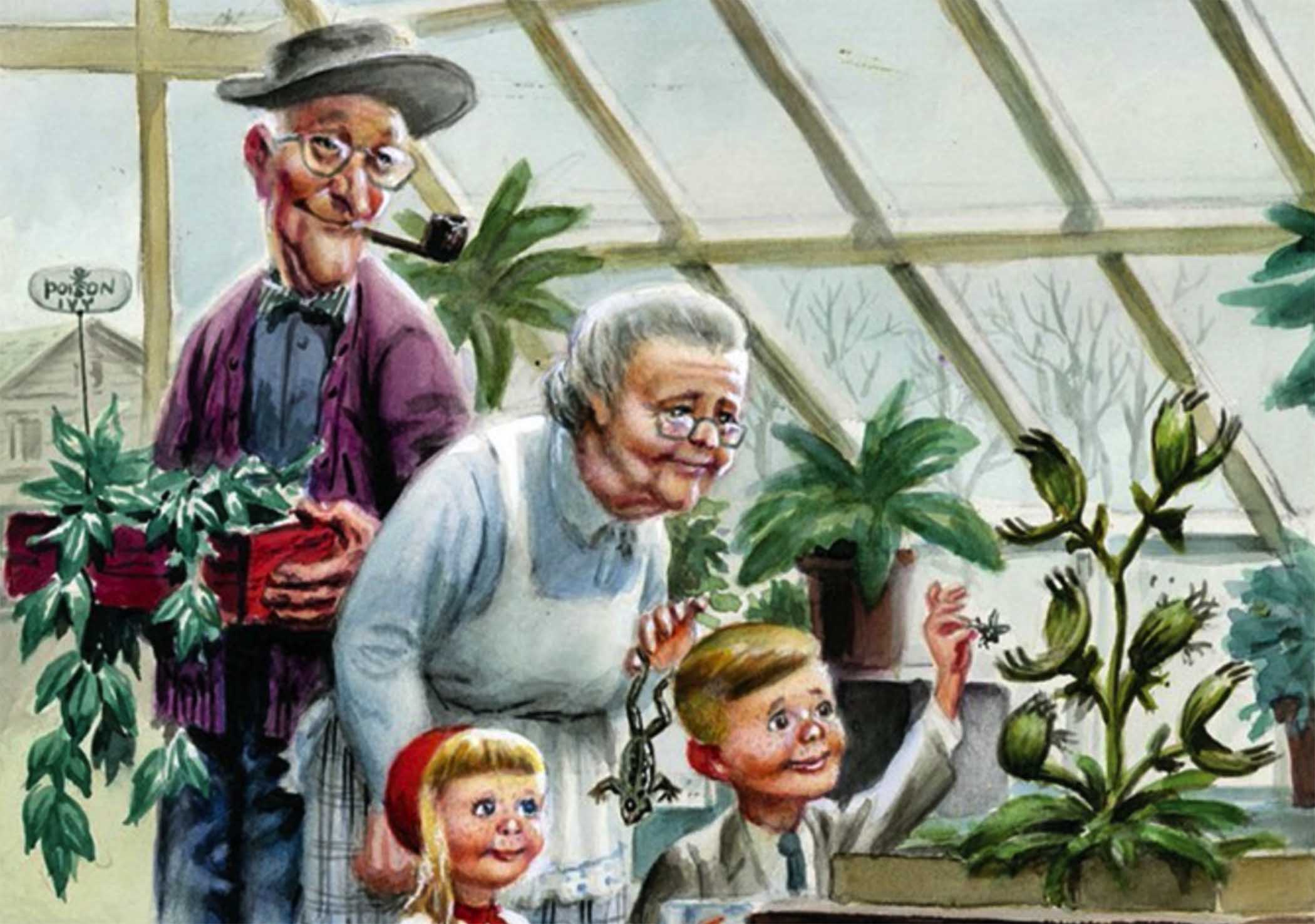 Which is too bad. Kurtzman was well into designing the third issue and had asked virtuoso illustrator Will Elder for a Norman Rockwell–style send-up of a kindly elderly couple entertaining their clean-cut grandkids in a greenhouse. In three versions, each more polished than the last, Elder refined details of poison ivy and other noxious flora to reveal the slow-burning realization that the smiling tots were feeding songbirds and goldfish to carnivorous Venus flytraps.