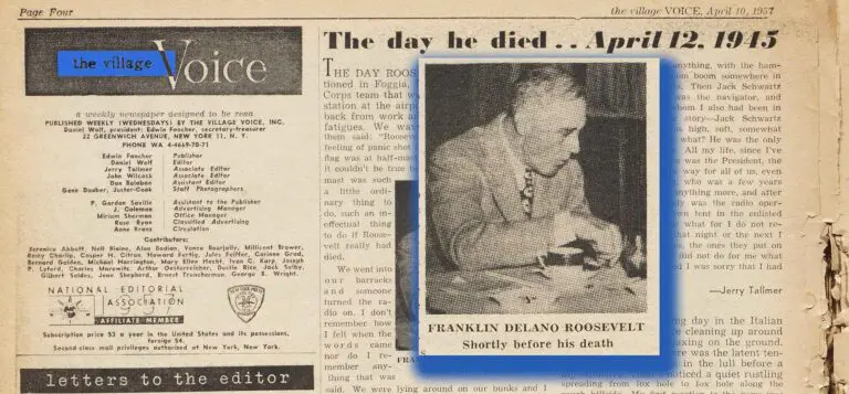 The day Roosevelt died I was stationed in Foggia, Italy, as part of a Signal Corps team that was installing a transmitter station at the airport there. We were riding back from work and passed some soldiers in fatigues. We waved at them and one of them said: “Roosevelt died, did you hear?” A feeling of panic shot through me. I noticed that the flag was at half-mast and remember thinking that it couldn’t be true because flying the flag at half-mast was such a little ordinary thing to do, such an ineffectual thing to do if Roosevelt really had died.
