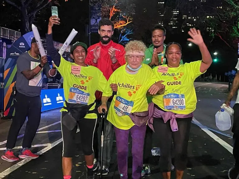 An hour later, Metellus announced that “in consideration of their neighbors,” the DJ had to stop playing and the hosts had to stop hosting. But the remaining members of the cheering section were loud enough to make up for any amplified sound, as 75-year-old Rozanna Radakovich, flanked by two of her Achilles International guides, crossed the marathon finish line for the 36th time, at 11:32 p.m.