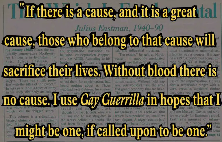 “These names, either I glorify them, or they glorify me, and in the case of Gay Guerrilla, that glorifies ‘gay.’ There aren’t many gay guerrillas. I don’t feel that gaydom does have that strength. Therefore I use that word in the hope that they will. At this point gay guerrillas can’t match Afghani guerrillas, or PLO guerrillas. A guerrilla is anyone who is sacrificing his life for a point of view. If there is a cause, and it is a great cause, those who belong to that cause will sacrifice their lives. Without blood there is no cause. I use Gay Guerrilla in hopes that I might be one, if called upon to be one.”