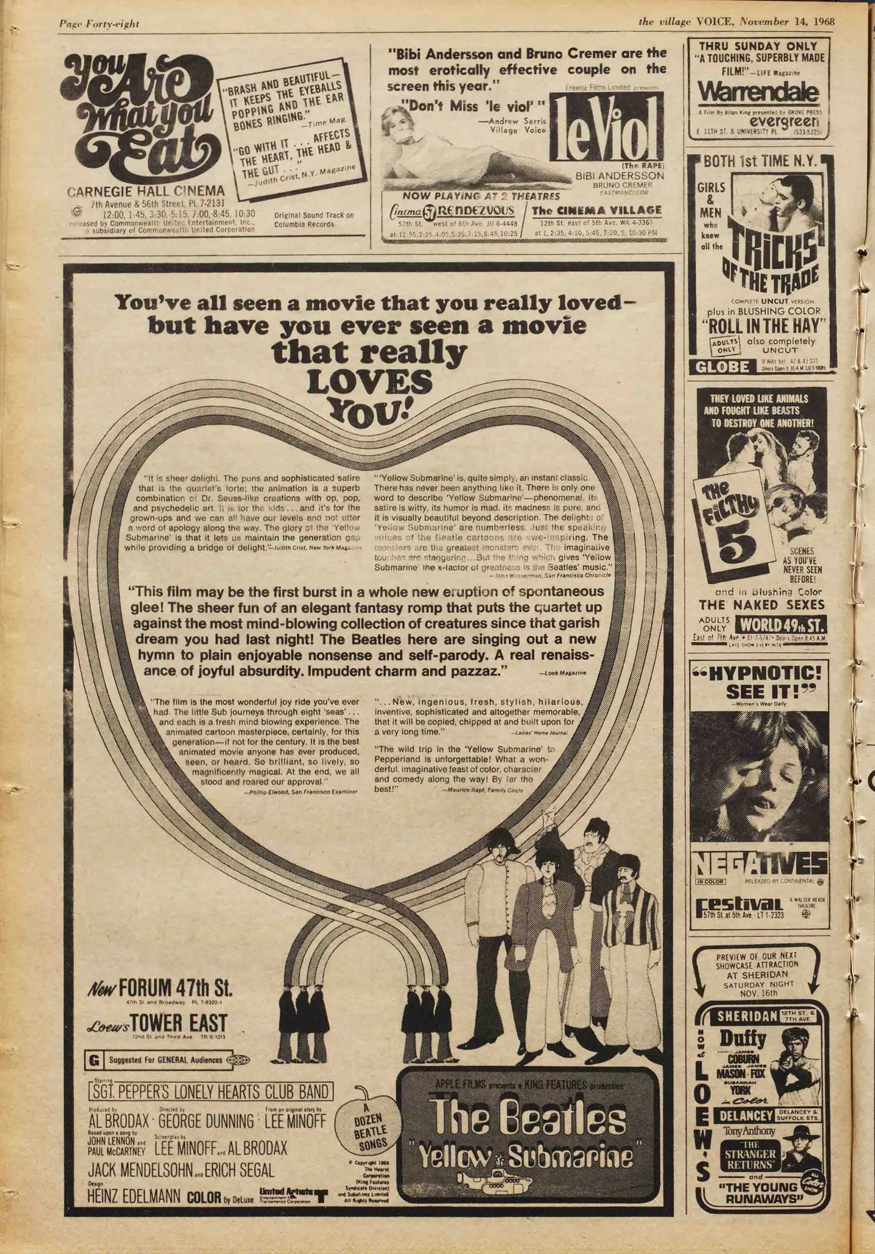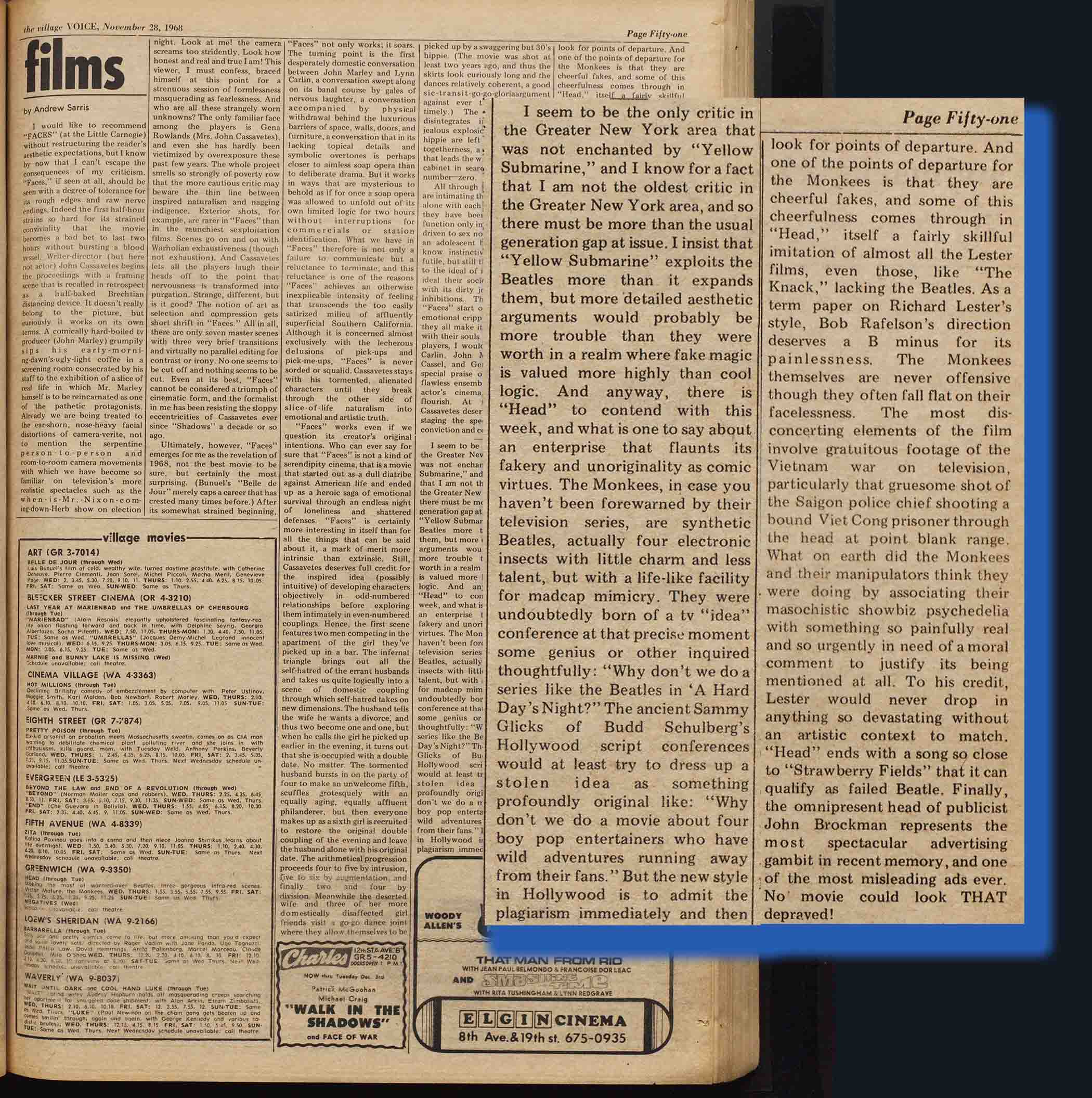 Voice critic Andrew Sarris was not amused, though he first notes that he might be the only critic, young or old, “not enchanted” with the Beatles’ Yellow Submarine. Then he delves into the Monkees’ undertaking: “And anyway, there is ‘Head’ to contend with this week, and what is one to say about an enterprise that flaunts its fakery and unoriginality as comic virtues. The Monkees, in case you haven’t been forewarned by their television series, are synthetic Beatles, actually four electronic insects with little charm and less talent, but with a life-like facility for madcap mimicry.” Decrying what he sees as the film’s unoriginality, he does allow that “the new style in Hollywood is to admit the plagiarism immediately and then look for points of departure. And one of the points of departure for the Monkees is that they are cheerful fakes, and some of this cheerfulness comes through in ‘Head.’” That appealing cheerfulness no doubt accounts for Sarris’s strong objection to the Vietnam execution footage — though at a half-century’s remove, it seems a jolt of genuine awareness, as if the filmmakers were truly questioning what was worth screaming about. Sometimes a misstep hits the mark. In his conclusion, Sarris clears up one mystery, noting that “the omnipresent head of publicist John Brockman [in the film’s ads] represents the most spectacular advertising gambit in recent memory, and one of the most misleading ads ever. No movie could look THAT depraved!”