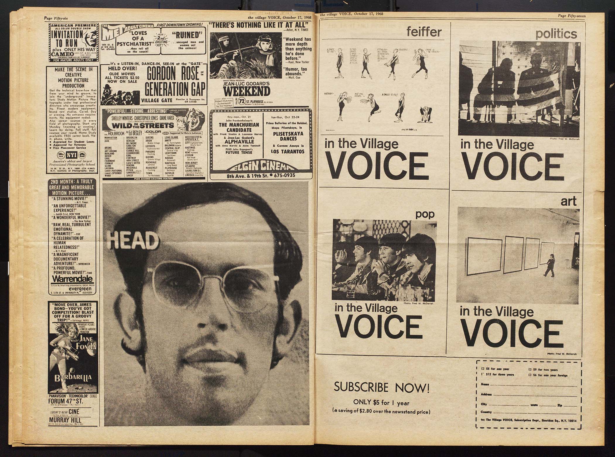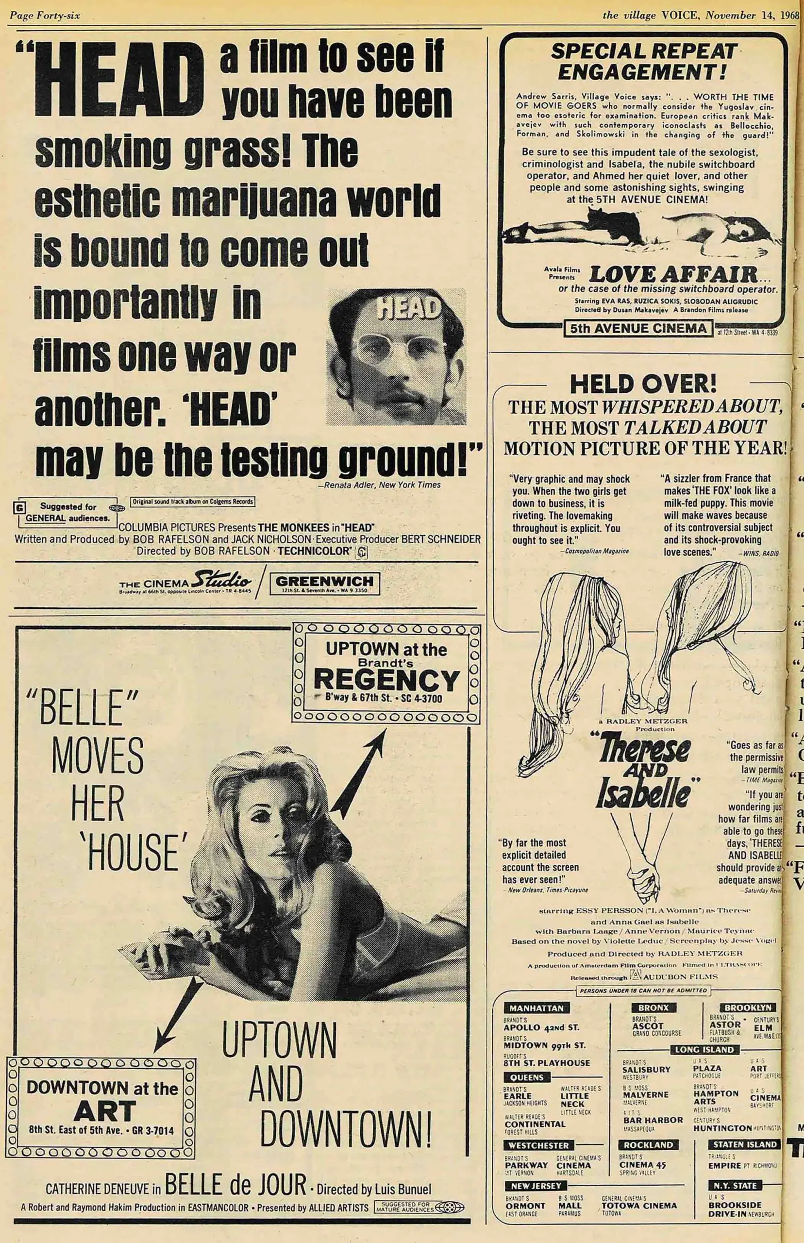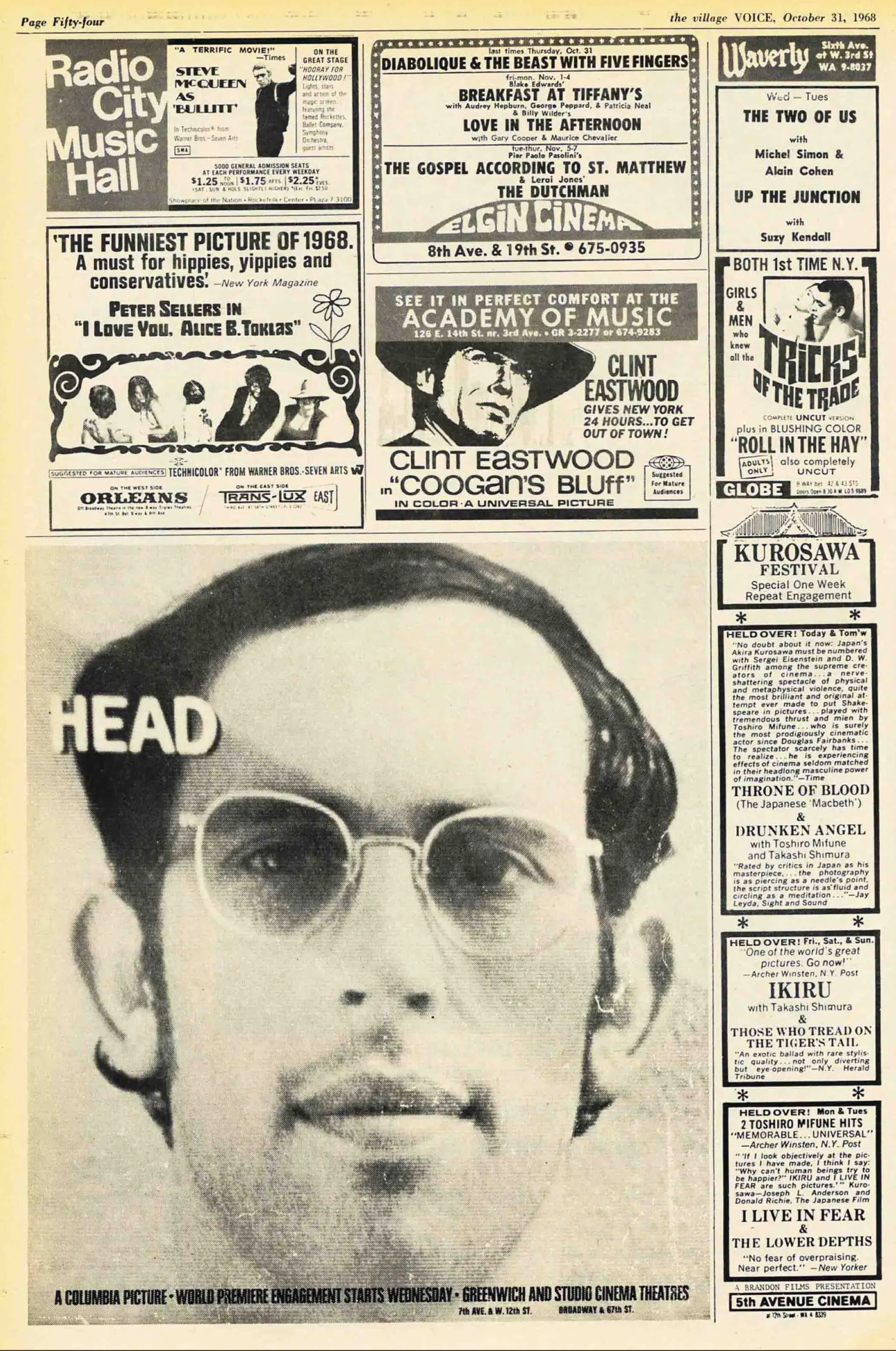 It was obvious that someone at Columbia felt Head had box office potential, because roughly a month out from the premiere, large mysterious ads began appearing in the pages of the Voice. A thick-lipped young man sporting a dark comb-over and glasses gazes at the reader; in the first two ads to run, the only copy — “HEAD” — acts as a textual dopplegänger to the half-tone image. Other movies advertised on those same pages give a sense of the era’s cultural tumult: Andy Warhol’s Flesh, Jane Fonda exposing much of her own skin in Barbarella, Godard’s visceral Weekend, Steve McQueen’s careening Mustang in Bullitt arriving for an engagement at Radio City Music Hall. But the Monkees couldn’t count on the savvy of New York’s downtown cognoscenti the way Warhol could — the quartet needed to appeal to a broader demographic, including the teen lasses who were certainly not expecting grainy execution footage in a pop-music jaunt. In a recent interview, Nesmith related that one of the film’s producers was insistent on using the violent clip, saying, “It’s anti-war, and it’ll have a big effect on the war.” Needless to say, the film had less impact in that regard than even the extremely oblique lyrics in “Last Train to Clarksville,” in which the song’s male protagonist says over and over to his girlfriend that she must meet him, because “I don’t know if I’m ever coming home.”
