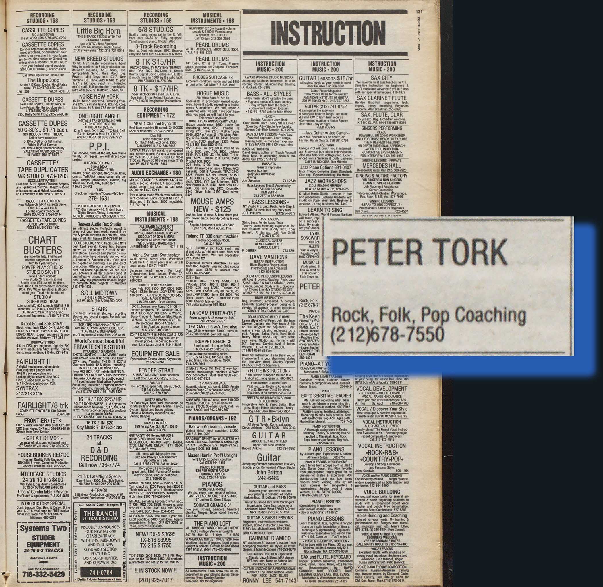 In 1970, Nicholson went on to star in Rafelson’s Five Easy Pieces, which boosted both men’s careers, while the Monkees descended to the nostalgia circuit in various permutations of the band’s lineup. They never again knew the heady stardom they enjoyed in the late Sixties, but they persevered in their music. While we were researching a different story one day in the Voice archives, a classified ad from the June 25, 1985, issue leaped out at us. We’re sorry we missed the opportunity to study with a master, back in the day. ❖